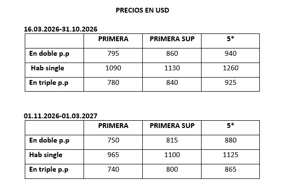- EL ITINERARIO MOSTRADO ES GENERICO Y PUEDE VARIAR SEGÚN EL DIA DE SALIDA O CONDICIONES DE OPERACIÓN EN DESTINO SIN AFECTAR AL CONTENIDO DEL VIAJE