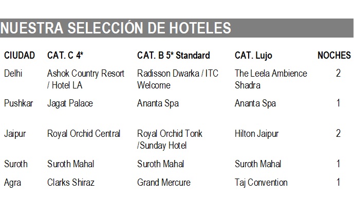 Desayuno Picnic. Traslado a la estación de ferrocarril para abordar en el tren Shatabdi con destino a Ajmer. Llegada y traslado por carretera al hotel en Pushkar. Por la tarde visita de la ciudad de Pushkar, centro de peregrinaje, muy importante para los hindús.Visita de templo de dios Brahma, paseo a pie por la calle principal de Pushkar y ver lago sagrado. Brahma, el Dios “creador” en una de sus representaciones, aparece con barba, cuatro cabezas, cuatro manos y el libro de los Vedas (conocimiento). Su vehículo es el cisne y su consorte es Savitri. Según la leyenda Pushkar significa “estanque nacido por la flor”, se formó cuando Brahma lanzó una flor de loto en la tierra para determinar un lugar para su “yagna”, un tipo de sacrificio santo. Pushkar se considera tan antigua como la creación en la religión hinduísta. El lago es considerado como uno de los lugares más sagrados, y se tiene la creencia que un simple chapuzón en las aguas del lago de Kartika Purnima es equivalente a realizar “yagnas” por varios cientos de años. Esta visita incluye los Ghats y el templo de Brahma, único templo dedicado al Dios Brahma en todo el país y que fue construido en el siglo XIV, sobre un alto zócalo de mármol cubriendo los pasos que condujeron a ella. Una hermosa tortuga tallada en plata se sienta en el suelo frente a “la sanctorum o Garbha Griha”. El suelo es de mármol alrededor de la tortuga. Alojamiento.