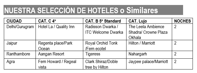 - Guías locales de habla hispana durante las visitas, excepto en Ranthambore donde les acompañará un guía especializado en la reserva y de habla en inglesa.