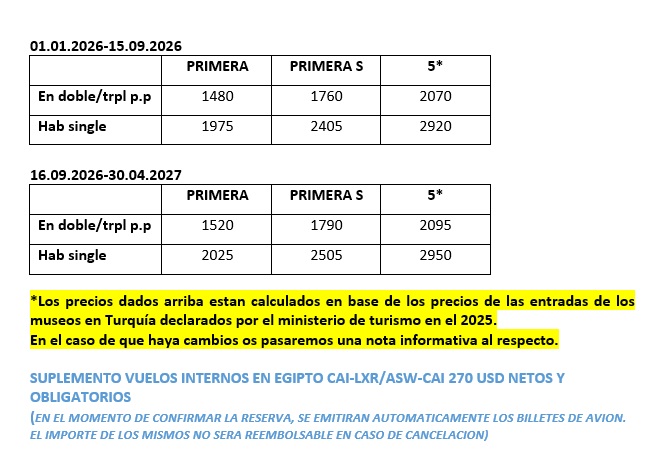 - Orden del itinerario detallado de Egipto es genérico, dicho orden varia según el día de llegada a destino y será informado el orden final al cliente en destino según los días de navegación de los barcos sin afectar al contenido del viaje